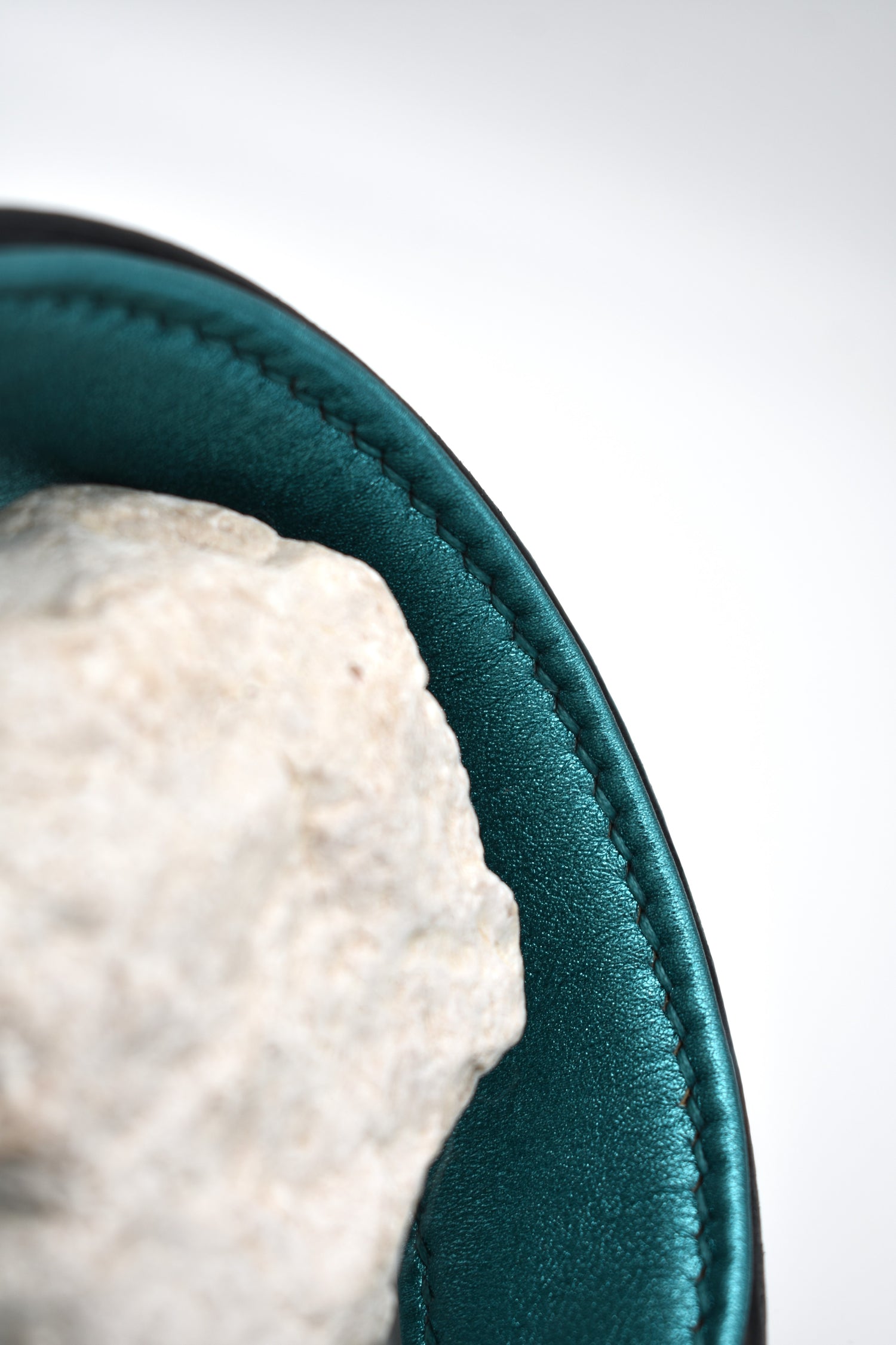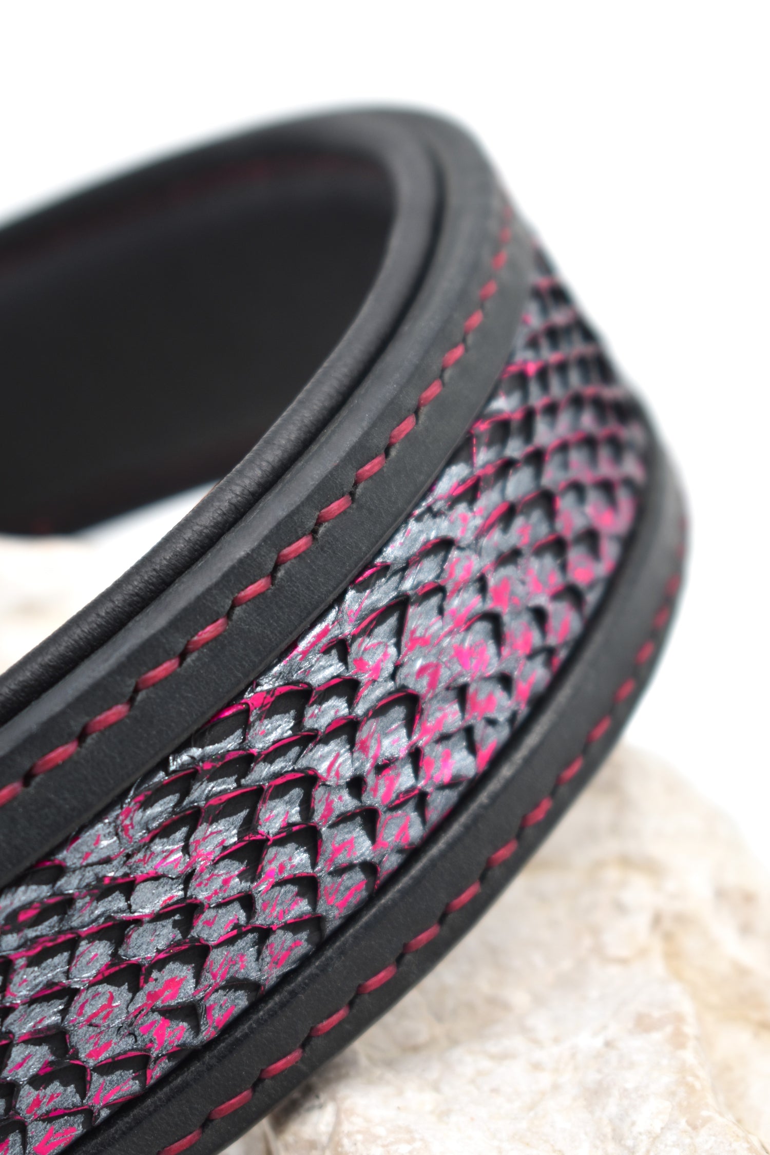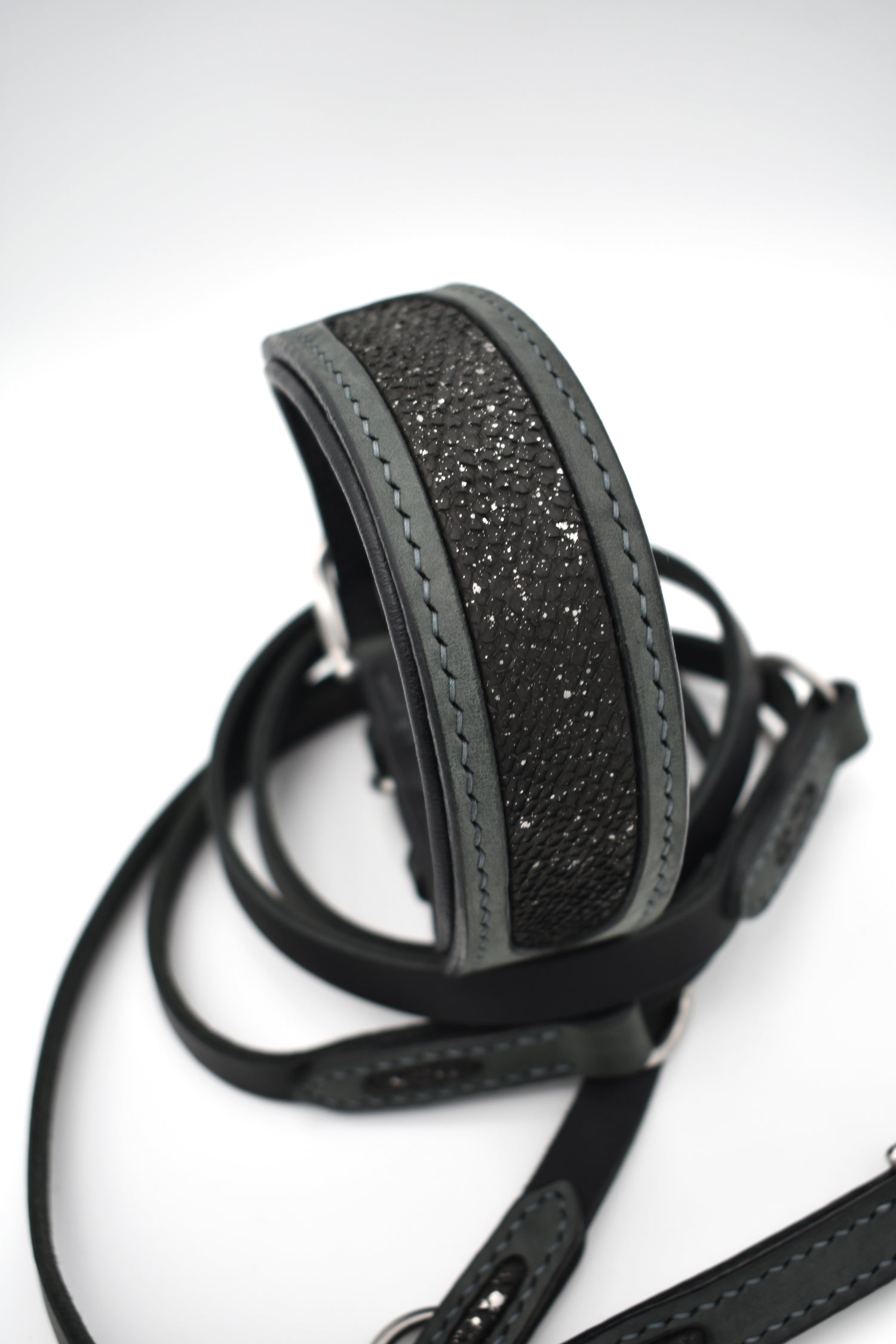 Ein einzigartiges Design, inspiriert von der Schönheit des Meeres: Ocean Glow besticht durch sein edles Inlay aus echtem Lachsleder, das mit seiner feinen, natürlichen Schuppenstruktur an das sanfte Glitzern der Wellen erinnert. Jedes Halsband wird mit viel Liebe zum Detail handgefertigt und ist ein wahres Unikat.